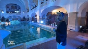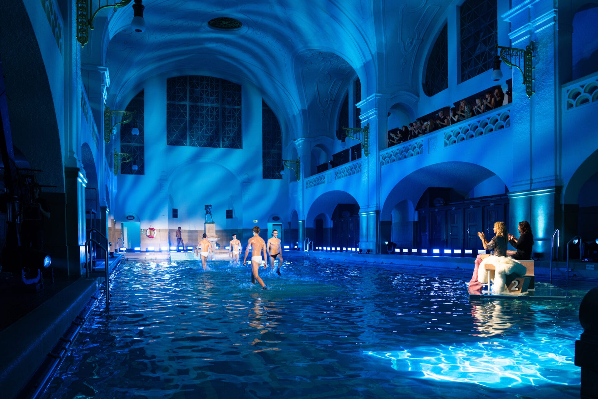 „Ich erwarte eine Fashion-Show, bei der die Rutsch- und Stolpergefahr erhöht wird“, so Keanu. Der spektakuläre Walk im historischen Müller’schen Volksbad bringt die Models an ihre Grenzen. „Ich bin schon ein wenig nervös und will wirklich nicht ins Wasser fallen“, gibt John zu. Alex: „Es kann schwierig werden. Wir wissen nicht, wie rutschig es wird.“ Kevin: „Jetzt heißt es Spaß haben!“ Heidi macht klar: „Heute sollen die Männer nicht feminin laufen, sondern taff! Es soll richtig spritzen.“