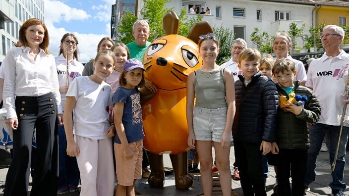 Nach einem mehrwöchigen Kuraufenthalt ist die Mausfigur am Freitagmittag (29.8.2025) wieder gut erholt und in neuem Glanz an ihren angestammten Platz vor dem WDR-Vierscheibenhaus in der Kölner Innenstadt zurückgekehrt. Herzlich begrüßt wurde sie von WDR-Intendantin Dr. Katrin Vernau, den Mausmoderatoren Christoph Biemann und Jana Forkel, dem Leiter des Kinderprogramms Matthias Körnich, vielen Kinder und Pressevertretern.
